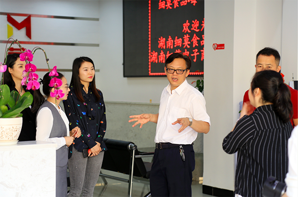 今日,长沙金霞经济开发区党工委委员、管委会副主任李剑刚先生,招商局局长张中文先生,招商合作局副局长范真先生,开福区国税局戴主任等一行领导莅临“细莫食品”进行考察工作,细莫高管团队全程陪同参观,并与金霞经济开发区各领导进行深入的交流。