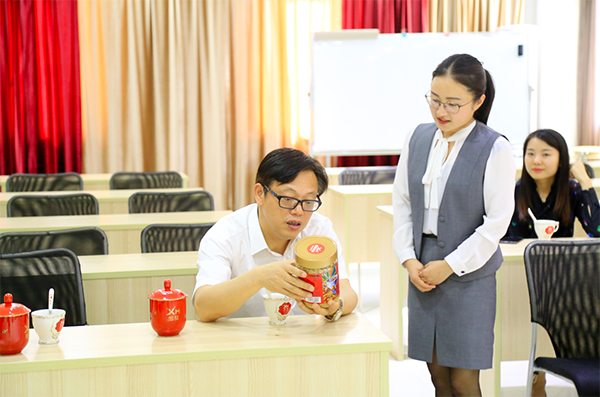 图为:细莫高管向李剑刚先生介绍细莫主打产品——红糖坚果茶