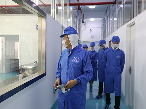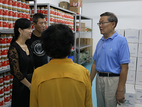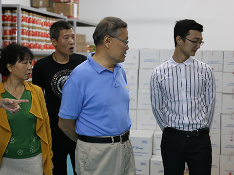 图为:何清华先生考察细莫食品生产与销售的每一个环节。