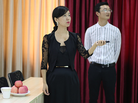 图为:细莫董事长莫静波女士向其一行介绍公司发展现状。
